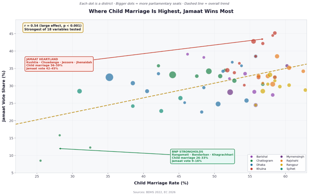 Among the 18 socio-demographic variables tested against both parties’ district-level vote shares, child marriage prevalence emerged with the strongest statistical association with Jamaat’s performance — highly significant even after correcting for multiple comparisons. It was stronger than poverty, literacy, urbanisation, madrasa density, or any employment variable.