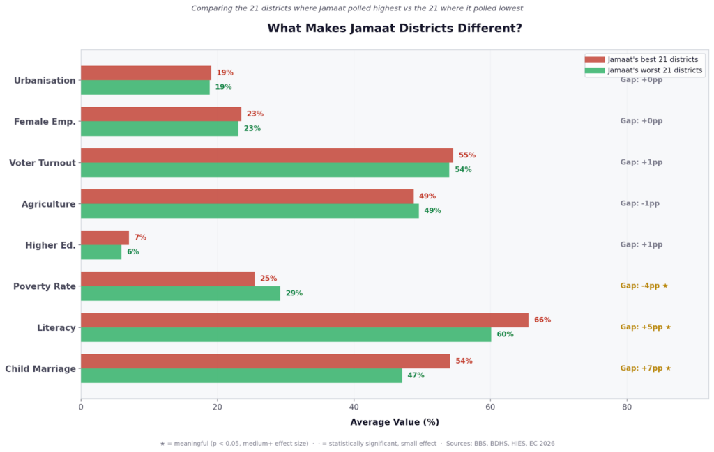 Several variables showed no statistically significant association with either party’s vote share: industrial employment, service sector employment, and population density among them. The poverty-Jamaat relationship, while statistically significant (Jamaat performs better in less poor districts), is moderate and does not survive as strongly in multivariate models. The “Jamaat is a party of the poor” narrative is not supported; but neither is “Jamaat is a party of the rich.” Its base is economically middling — smallholder agriculture, market towns, remittance income.