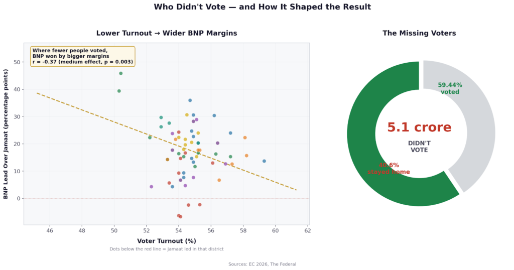 The statistical data offers a suggestive, though not definitive, clue. Turnout shows a statistically significant negative association with BNP’s vote share. In districts where fewer people voted, BNP tended to win by wider margins. This is consistent with a scenario where Awami League-leaning voters — particularly the urban liberal and secular-leaning professional class that formed AL’s core — disproportionately abstained, amplifying BNP’s margins without the party needing to expand its actual base.