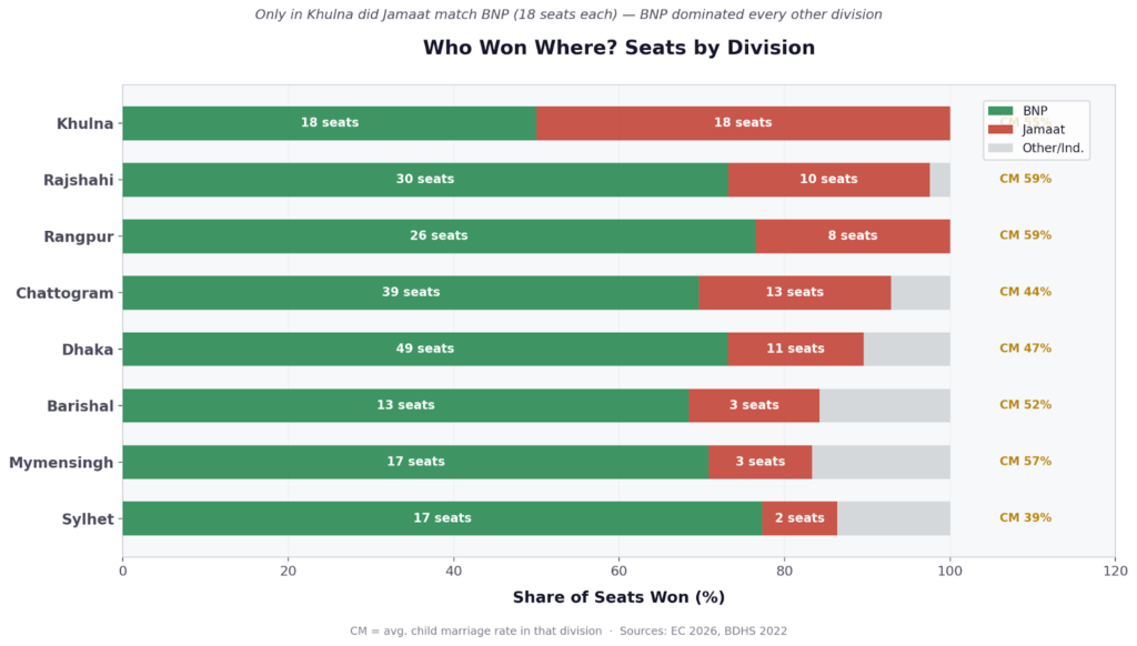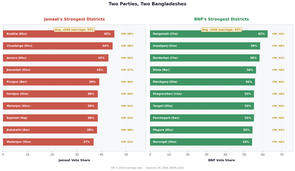 Jamaat’s Bangladesh is geographically concentrated, organisationally disciplined, and socially conservative in character, though increasingly diverse at the margins through the NCP’s urban youth base. Its heartland is a zone of higher child marriage, lower female workforce participation, reform-oriented religious ecosystems, and a political culture responsive to moral governance messaging. It is a genuine electoral force — the party’s leap to 68 seats and over 30 per cent of the popular vote is historically unprecedented — but it is regionally bounded in ways that the party’s social media presence may obscure.