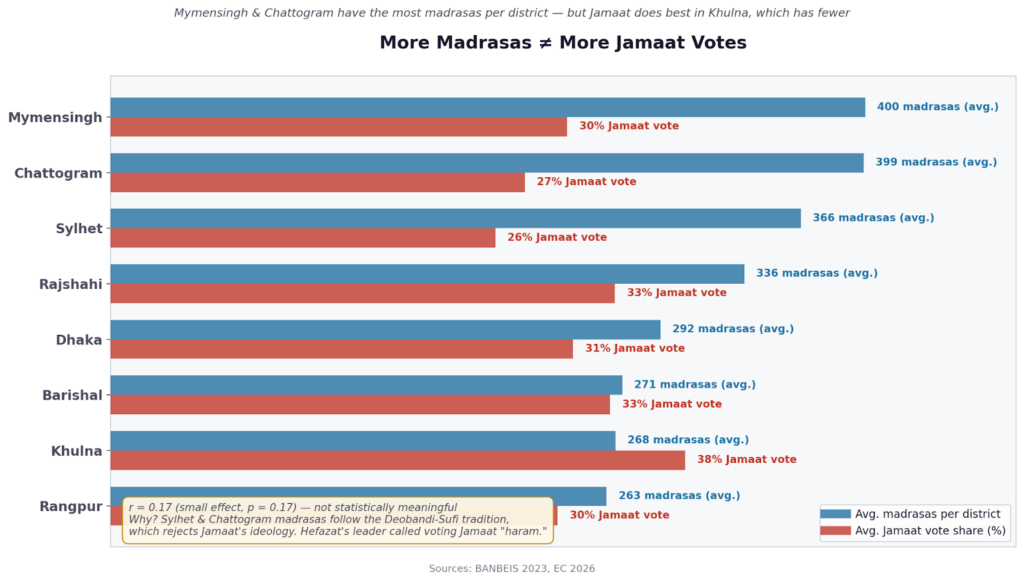 The depth of this hostility matters electorally. Hefazat’s Babunagari explicitly supported BNP candidates in Chittagong. BNP also maintained its longstanding alliance with Bangladesh Jamiat Ulama-e-Islam, a Qawmi clerical party that — significantly — supported the 1971 liberation struggle, giving BNP a way to court the Qawmi vote without the ideological baggage of Jamaat’s wartime history. The result: in Sylhet and Chittagong, despite having some of the highest Qawmi madrasa densities in the country, Jamaat’s vote share remained well below its national average. Madrasa density alone does not significantly predict Jamaat’s vote — what matters is the kind of Islamic tradition those madrasas represent.